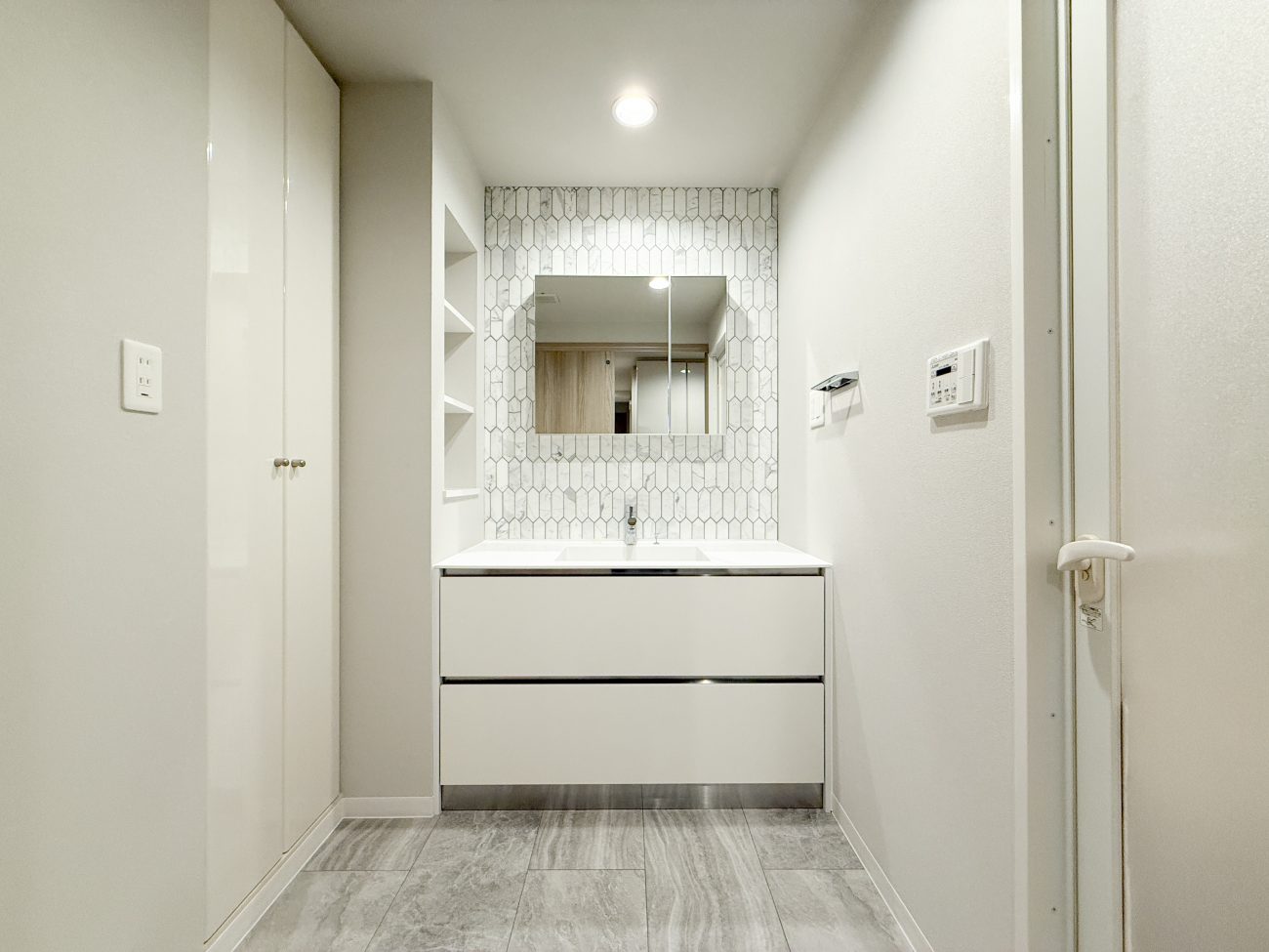 また、洗面台もシンク一体型の洗面化粧台に交換し、正面にモザイクタイル貼りを行い、ホテルライクな洗面台にリニューアルしています。