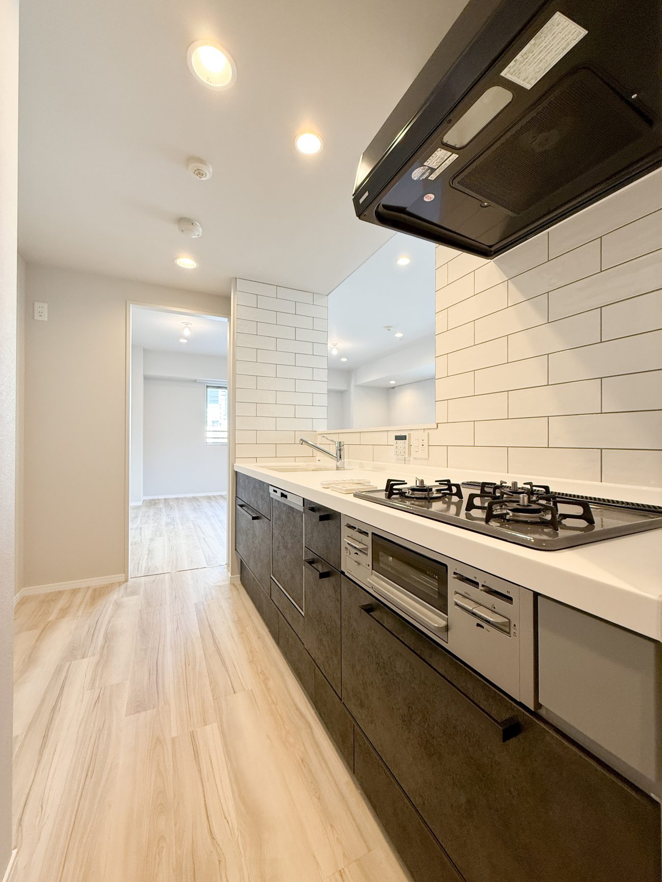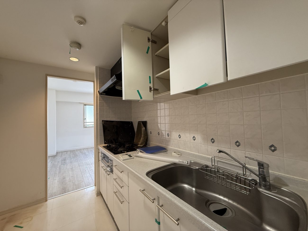 キッチンはキッチンとコンロを入れ替えることで、キッチン正面の壁を撤去し、リビングと一体とし、開放的なキッチンとしました。