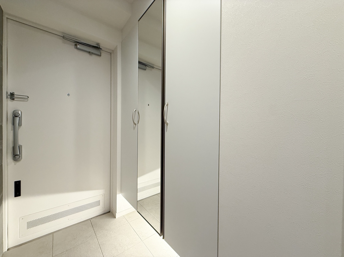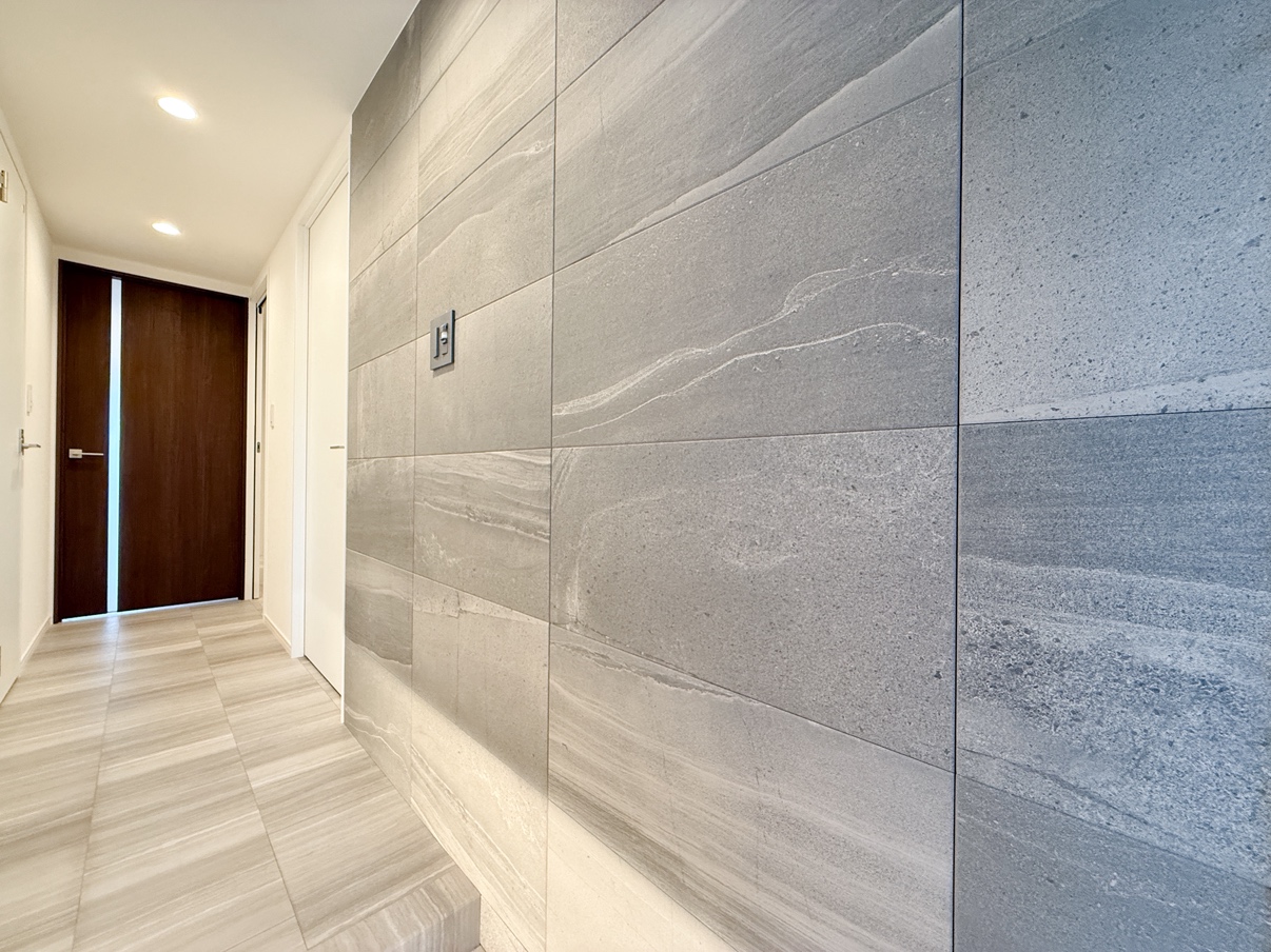 ・玄関壁面には一面エコカラットを採用し、クロス仕上げにはない高級感を演出。