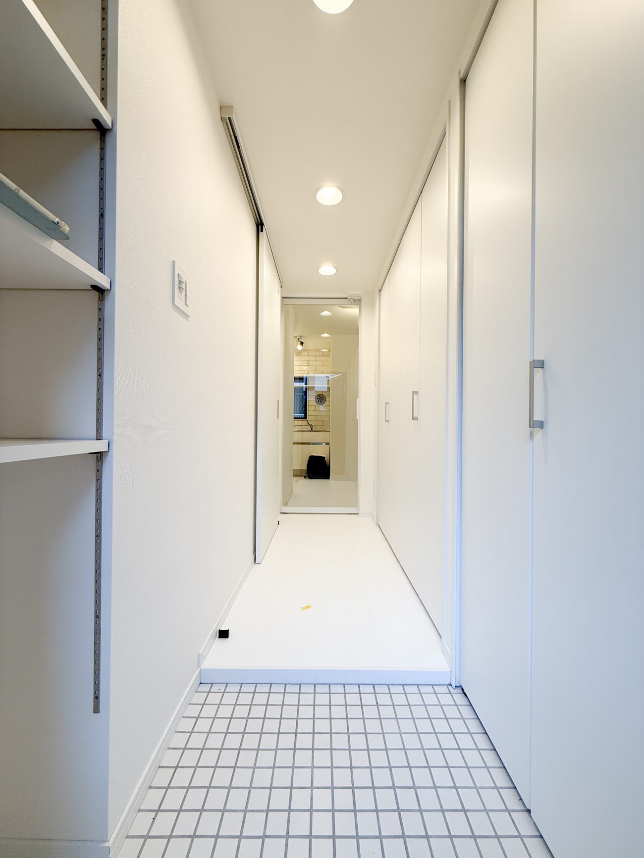 - 床材やクロスはもちろん、タイル、建具やサッシ、棚からブラケット等の小物に至るまで、全て白で統一することで、イメージ通り美容室の様な空間に仕上がりました。