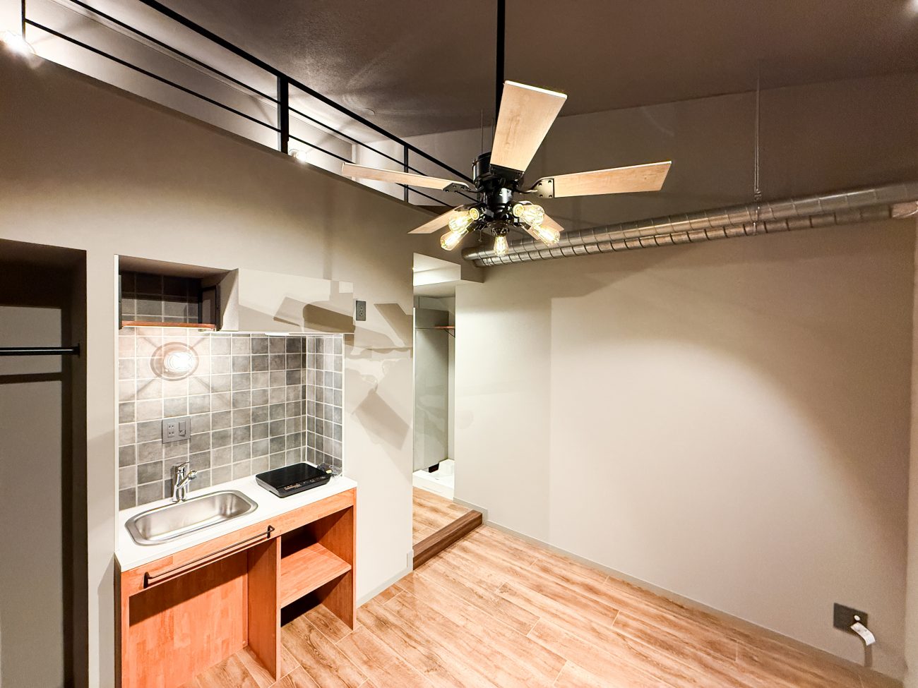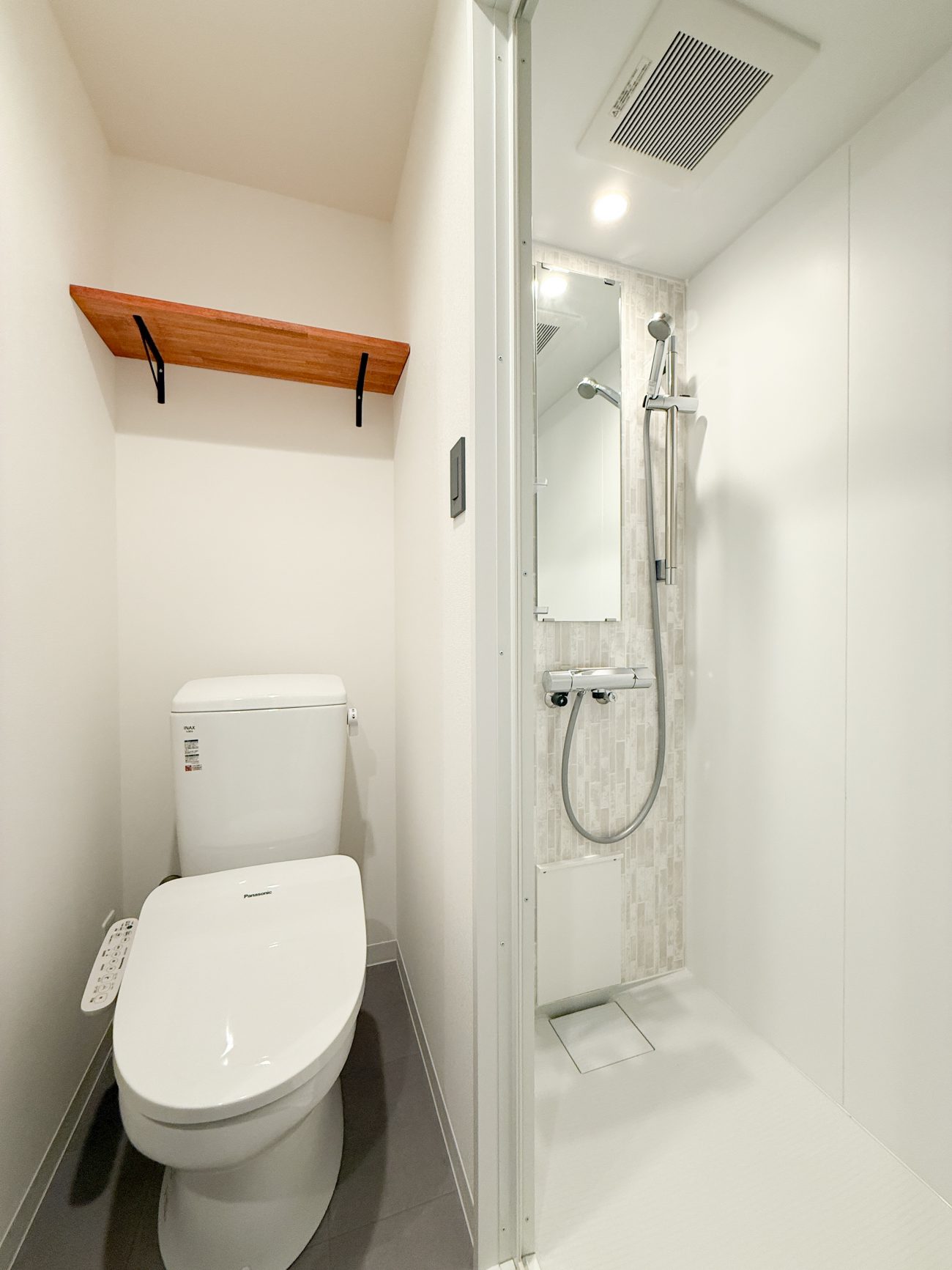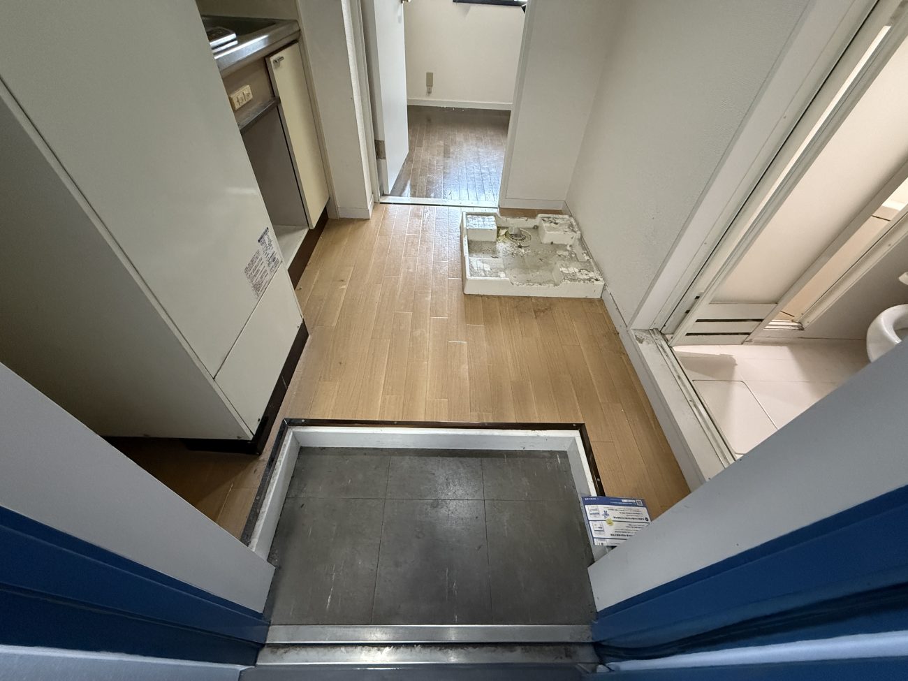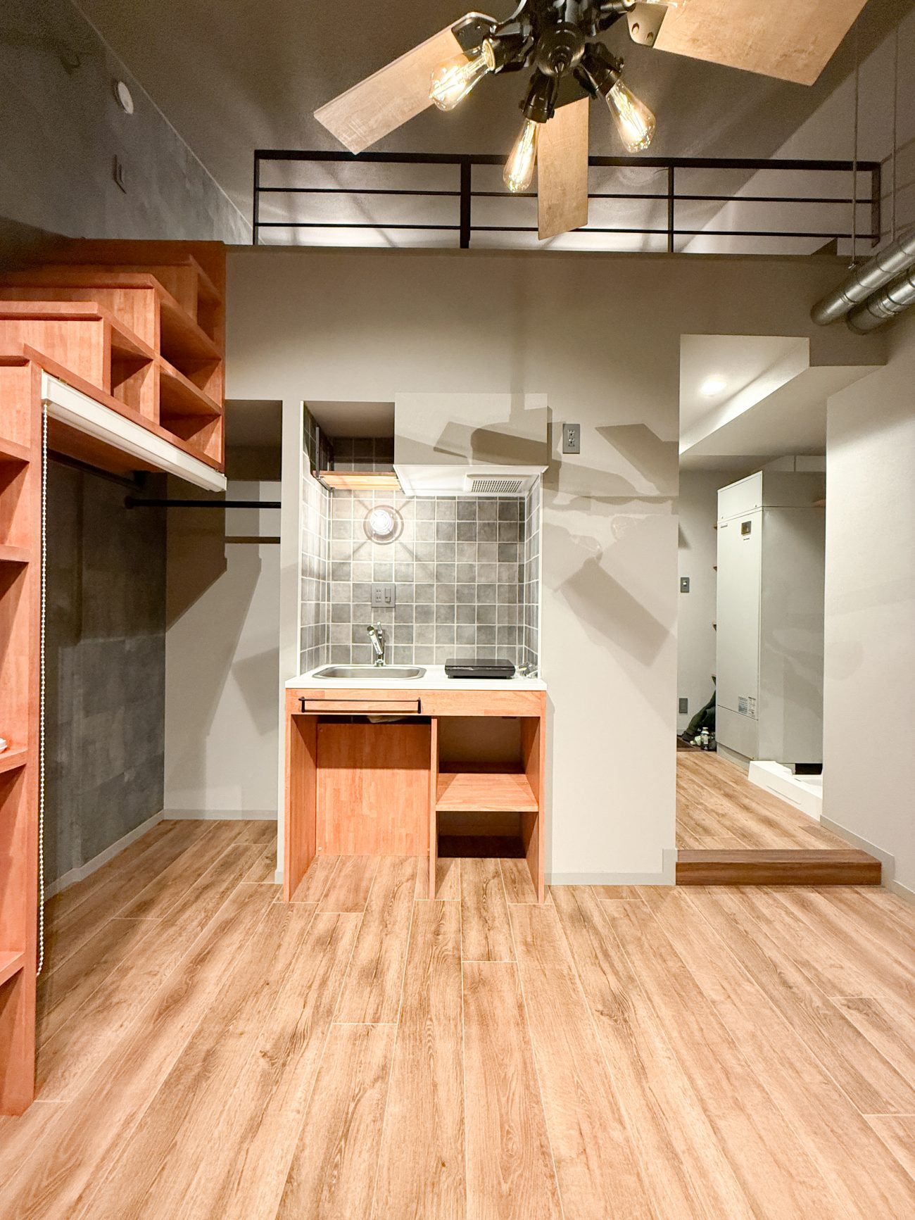 水回りはいつも通り、シャワーにして独立洗面、トイレを設置し、最低限の使い勝手を確保しました。また、キッチンを居室に移動させることで、元キッチン部分には洗濯機パン、靴置き用の稼働棚を設置することで、従前の居室面積を確保しています。