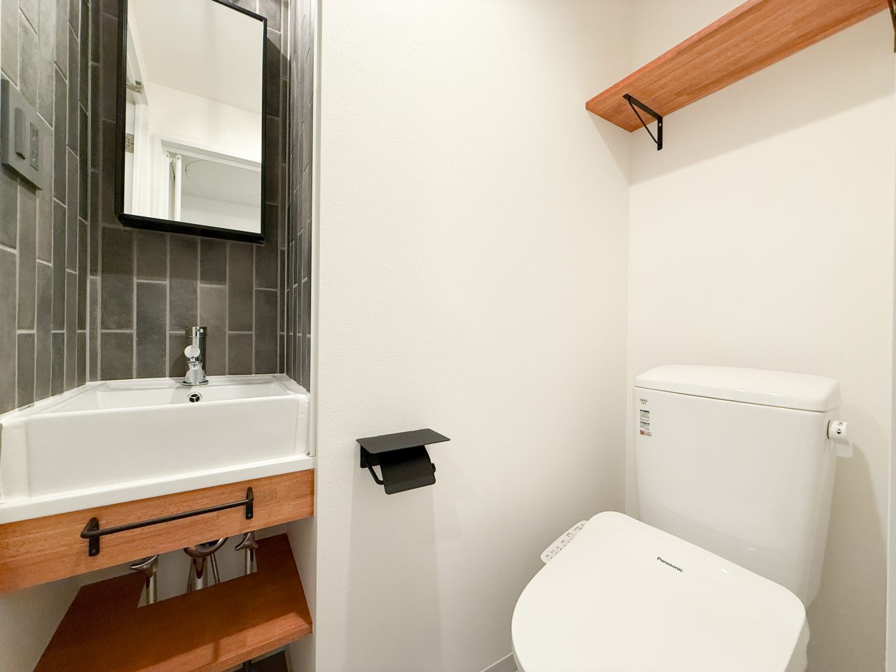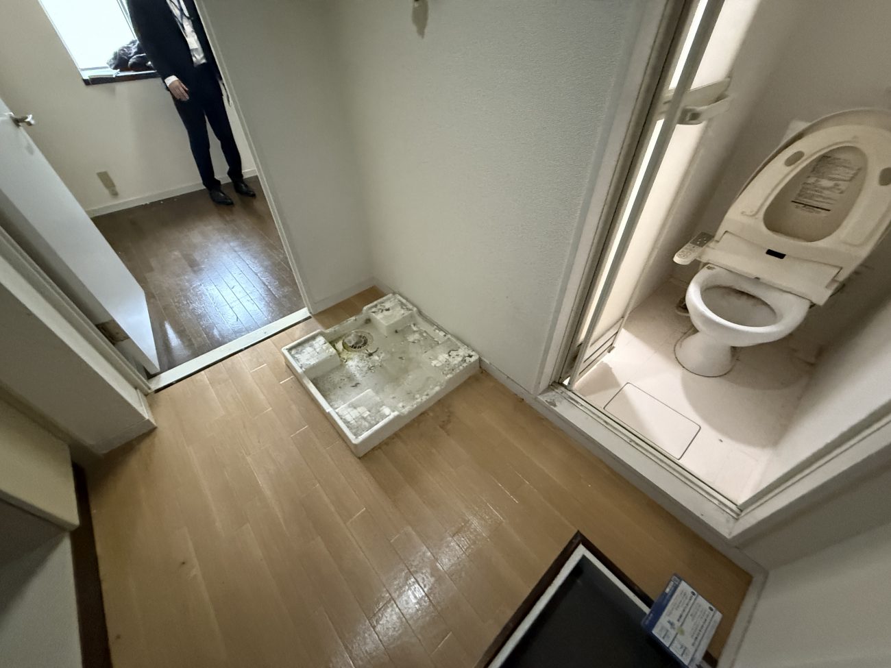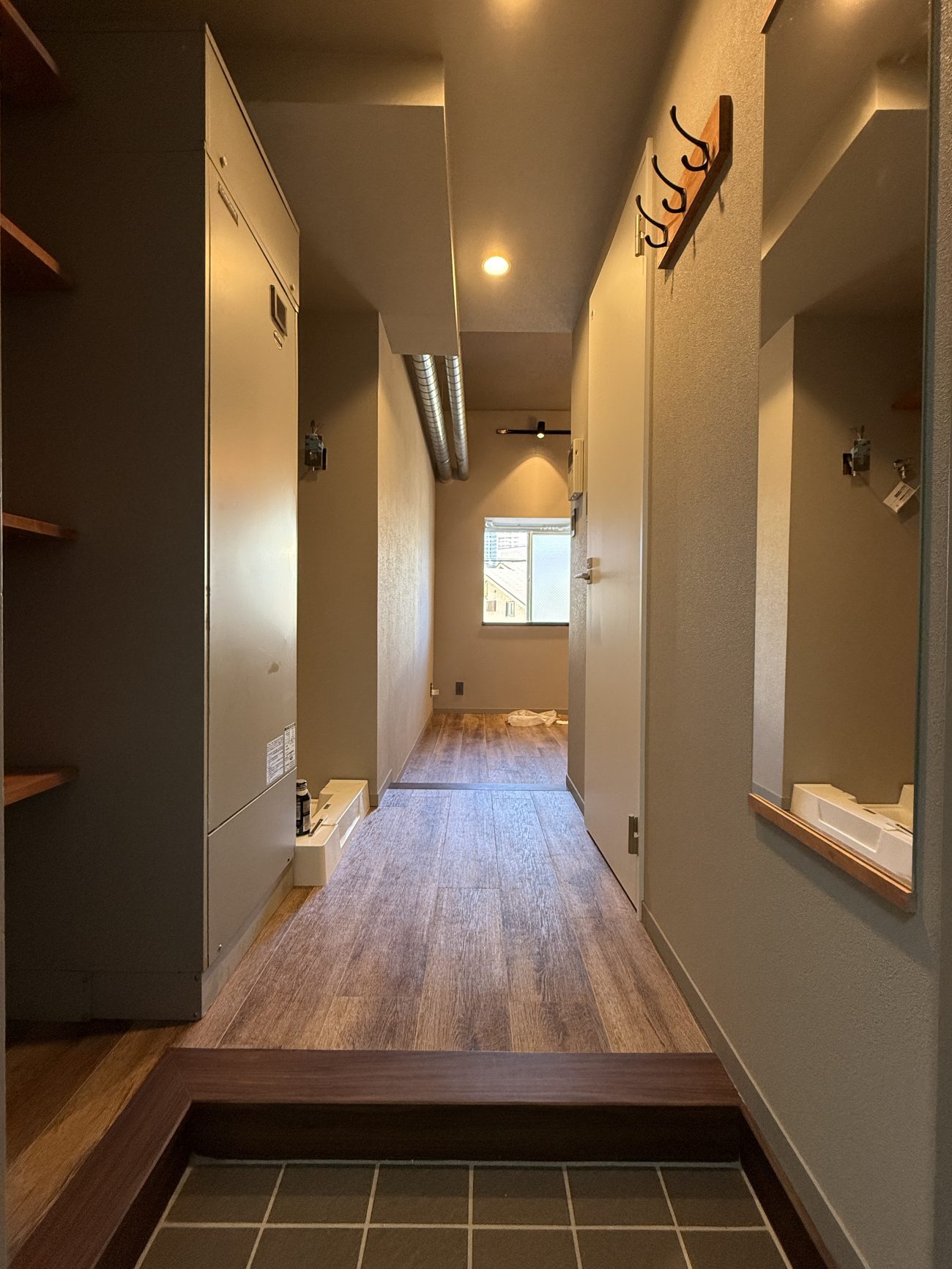 水回りはいつも通り、シャワーにして独立洗面、トイレを設置し、最低限の使い勝手を確保しました。また、キッチンを居室に移動させることで、元キッチン部分には洗濯機パン、靴置き用の稼働棚を設置することで、従前の居室面積を確保しています。