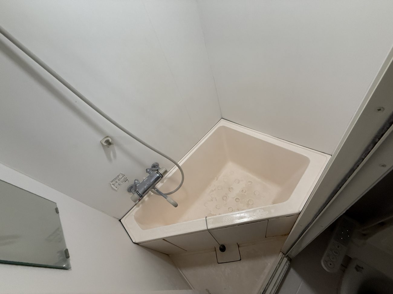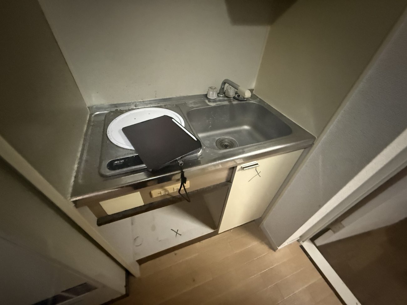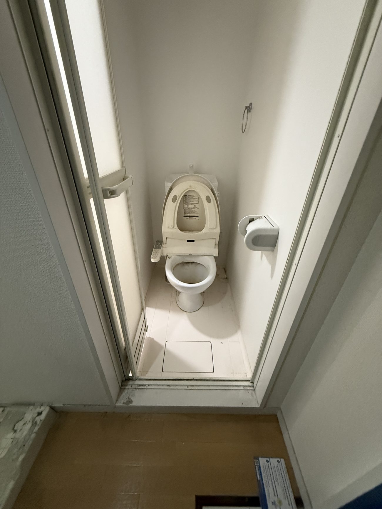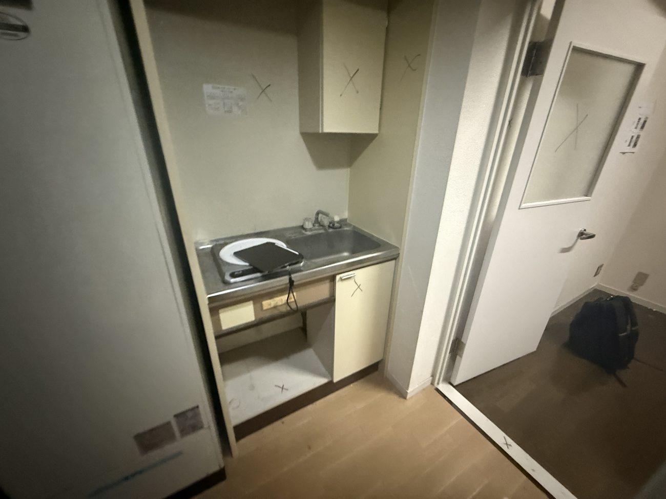 水回りはいつも通り、シャワーにして独立洗面、トイレを設置し、最低限の使い勝手を確保しました。また、キッチンを居室に移動させることで、元キッチン部分には洗濯機パン、靴置き用の稼働棚を設置することで、従前の居室面積を確保しています。