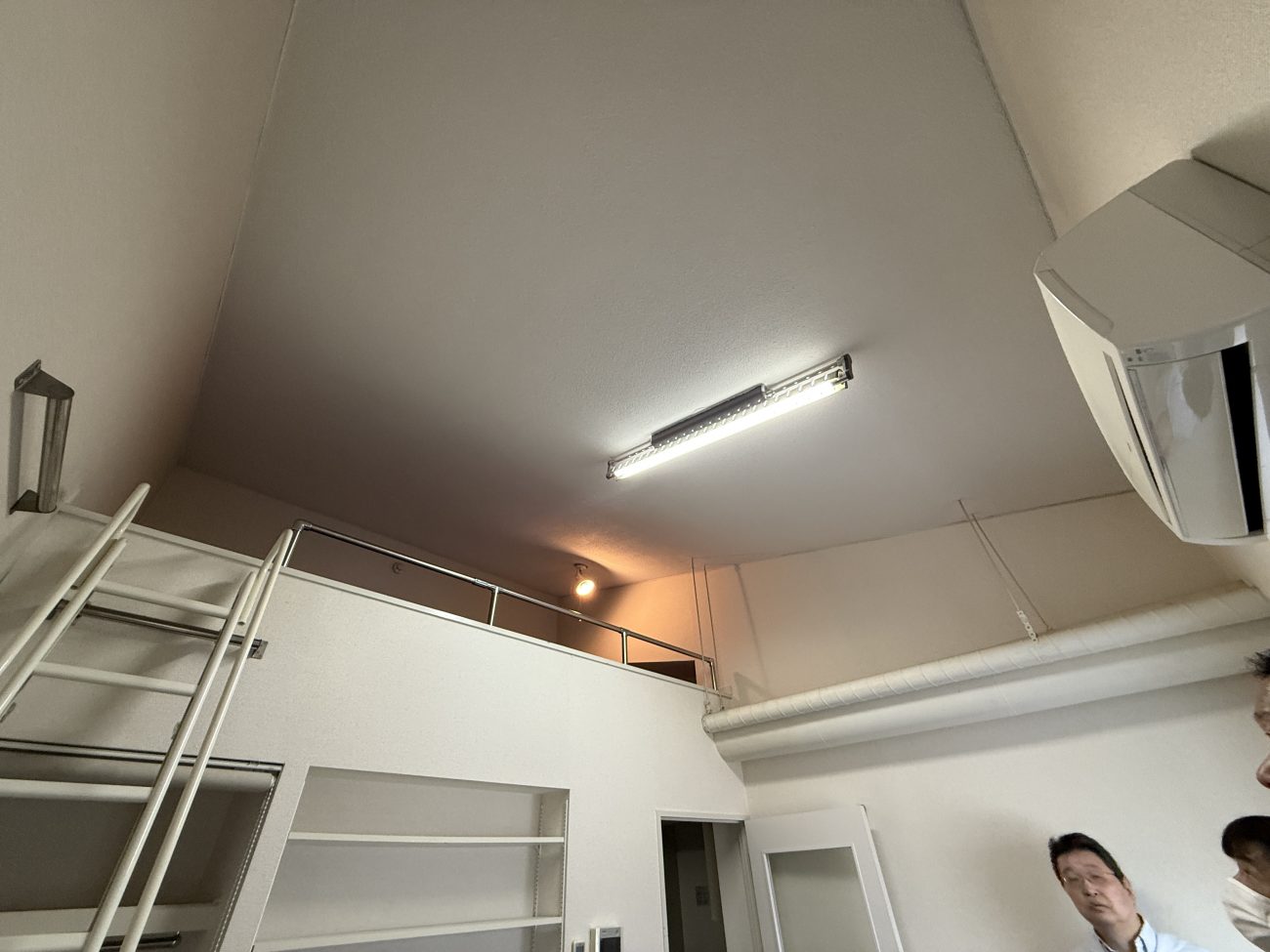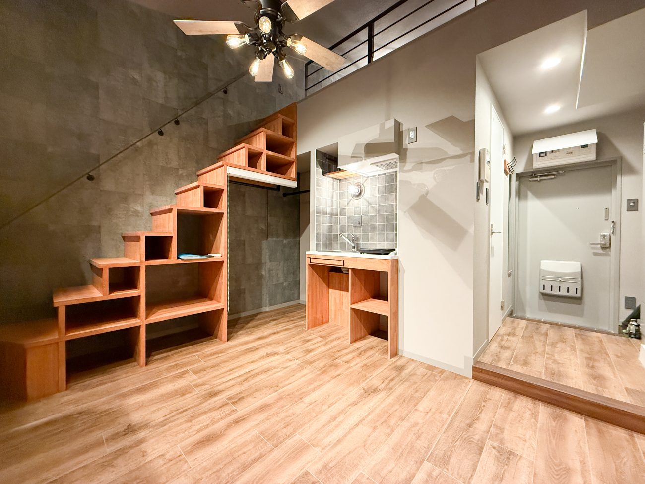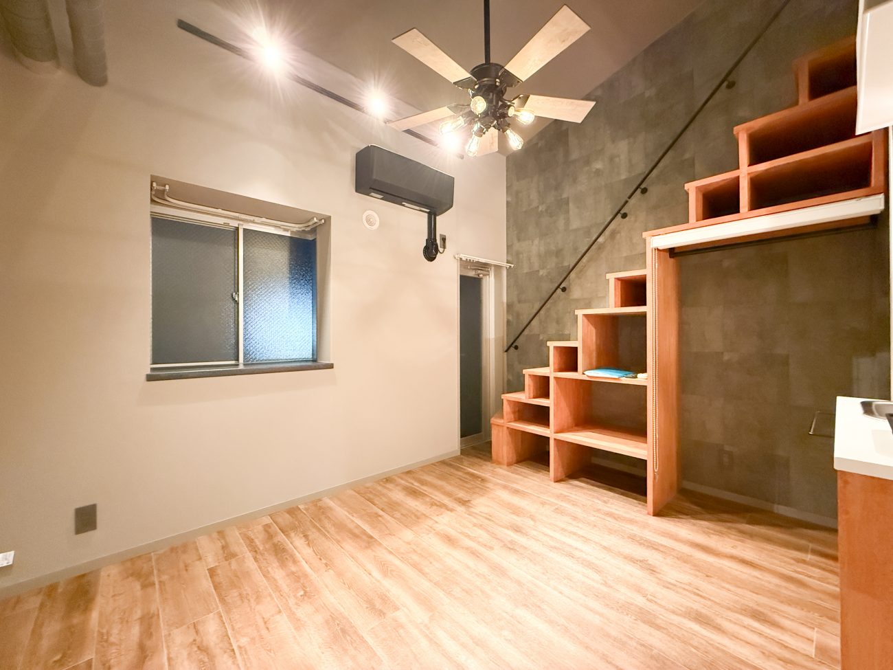 シーリング照明も空調機能もあるファン付き照明として、機能性にも配慮しつつ、ロフト階段は造作で本棚兼階段を新たに設けることで、ロフトの導線を大幅に改良するとともに、収納も担保しています。